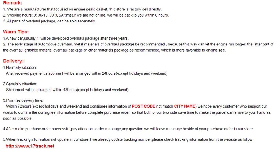 In order to ensure the safety of the goods to reach your hands as quickly as possible,  we provide adequate benefits, and for full gasket set we will take DHL free shipping way to most countries in the world.