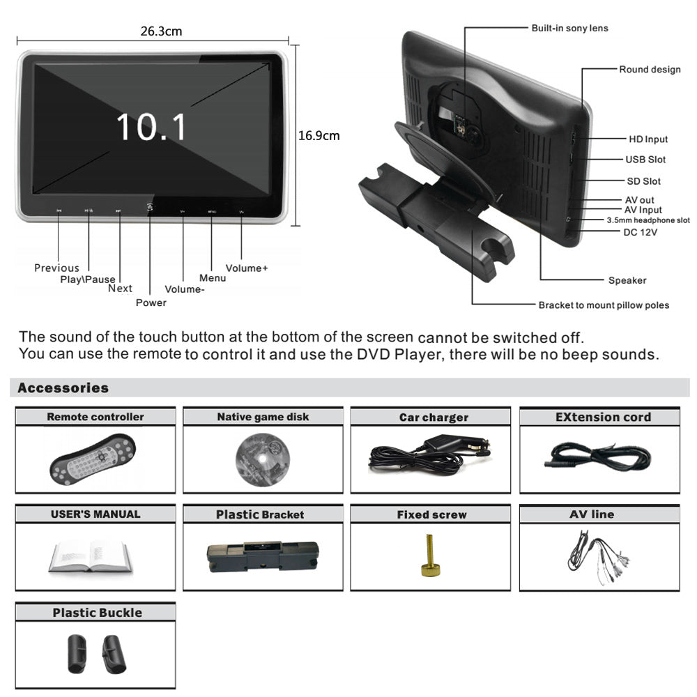 10.1 Inches Car Headrest DVD Player Auto Monitor Touch Button Built-in Speakers Support Game Disk FM IR HD Input SD Card Slot
