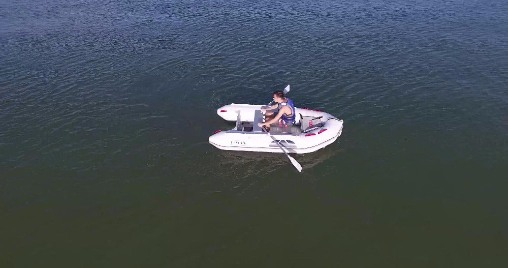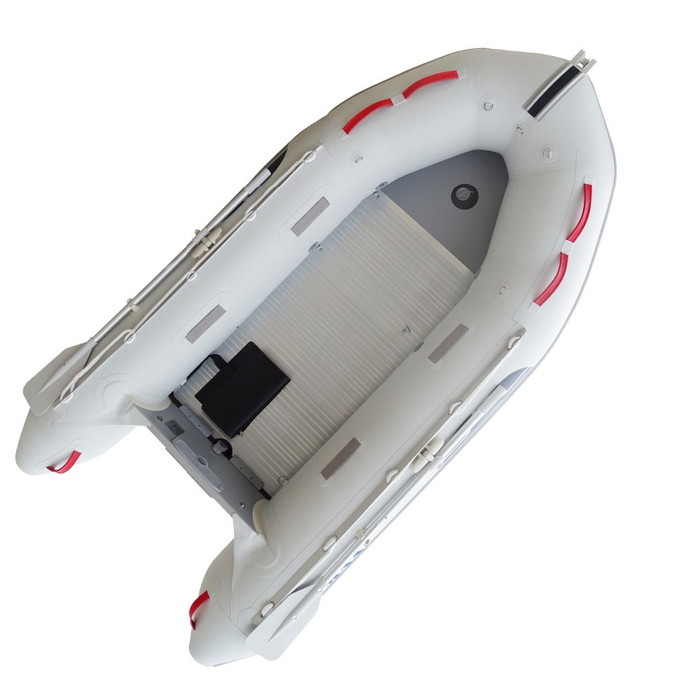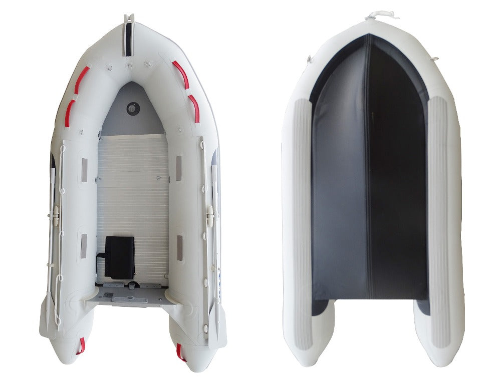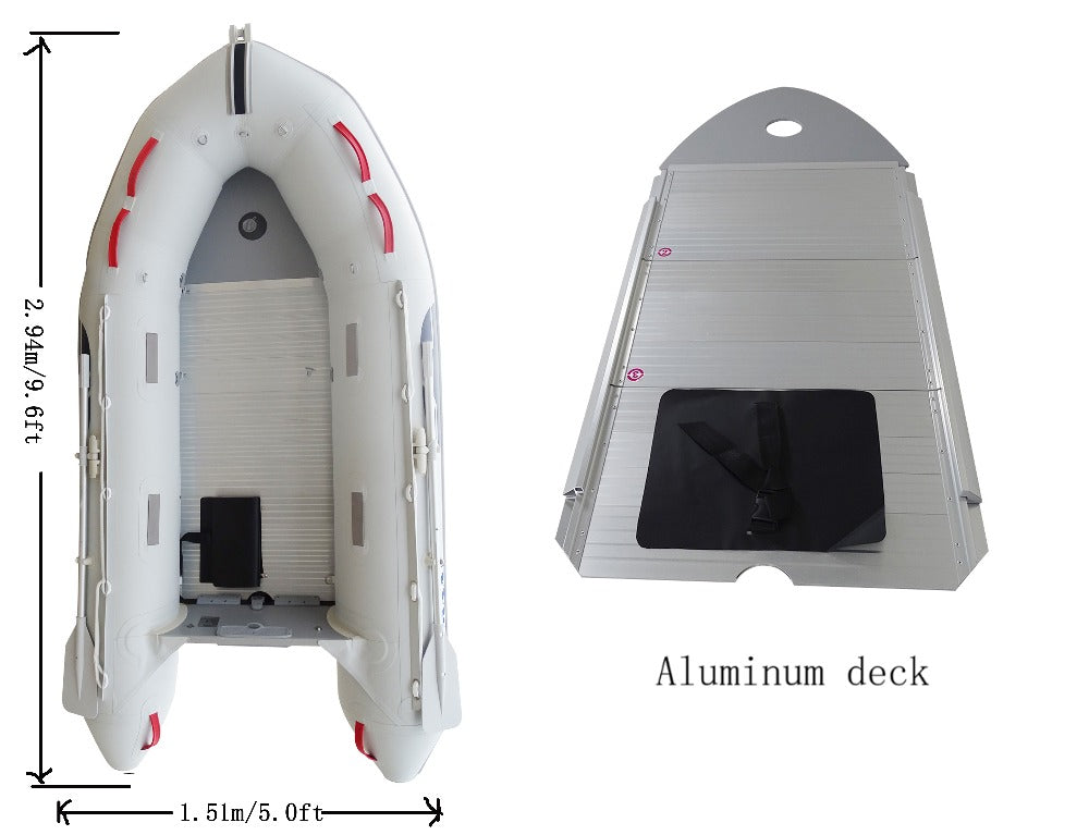 2) PREMIUM QUALITY:Triple layered 0.9 mm PVC material is UV,oil,stain and puncture resistant.This PVC material is imported from Germany.Material is aluminum alloy bottom,non-skid 4-section aluminum floor,flat and solid, walk on boat steadily.Three individual chambers, aluminum side joiners with rubber ends. 24 mm thick aluminum framed custom hard marine coated plywood floor.